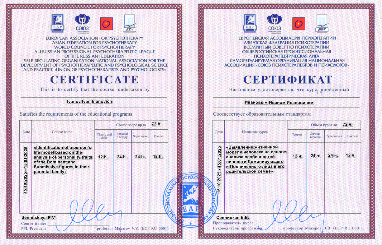 Помимо удостоверения о повышении квалификации, желающие могут также получить сертификат Общероссийской Профессиональной Психотерапевтической лиги с указанием часов: теория 12 ч., практика 12 ч., супервизия 24 ч., личная терапия 24 ч. (бланк сертификата и его доставка оплачивается слушателем).